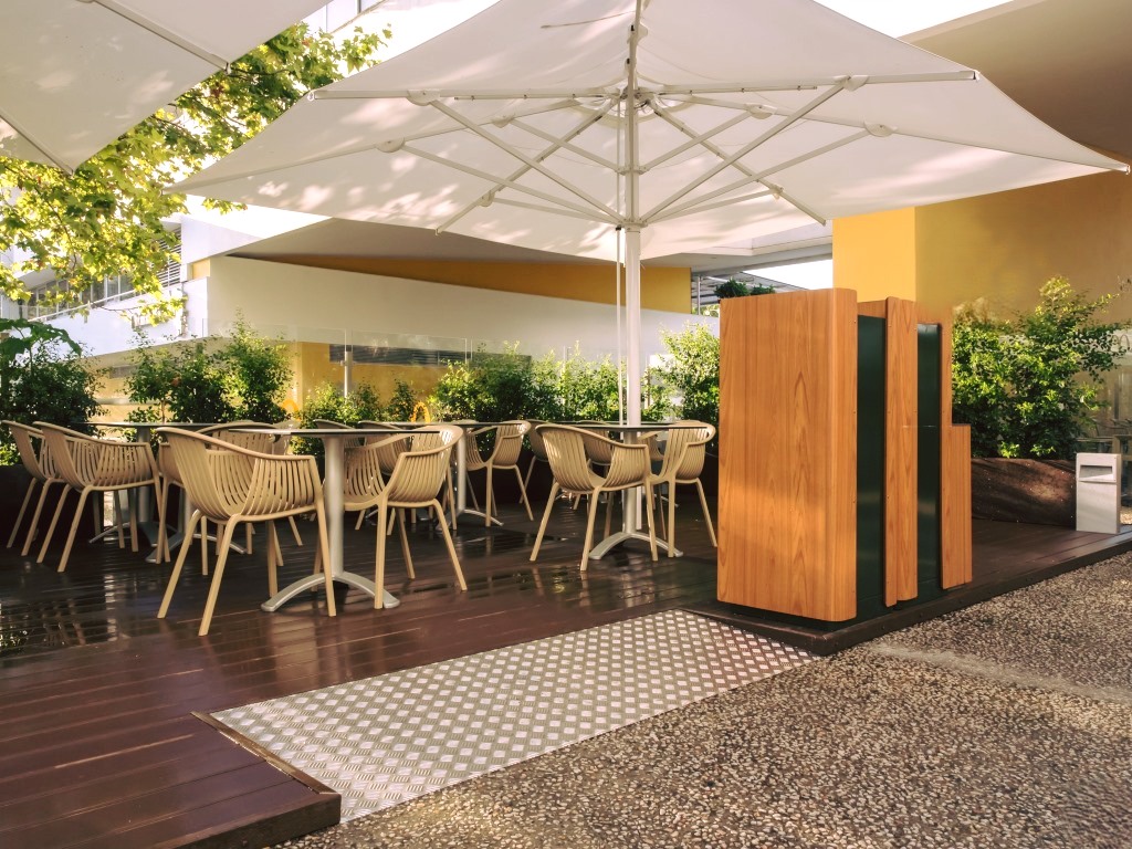 وجود شمسية خارجية فوق الطاولة يسمح باستخدام المكان في مختلف أوقات اليوم دون القلق من حرارة الشمس.